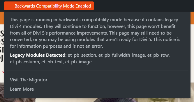 Bestätigt man dies und schaut sich dann das Frontend seiner Website an, dann hat sich dort noch nichts verändert. Die folgende Meldung im Admin-Bar erklärt auch, warum dies so ist: Solange Divi noch Divi-4-Module auf der Seite findet, wird der Kompatibilitäts-Modus aktiviert und die Seite bleibt unverändert.