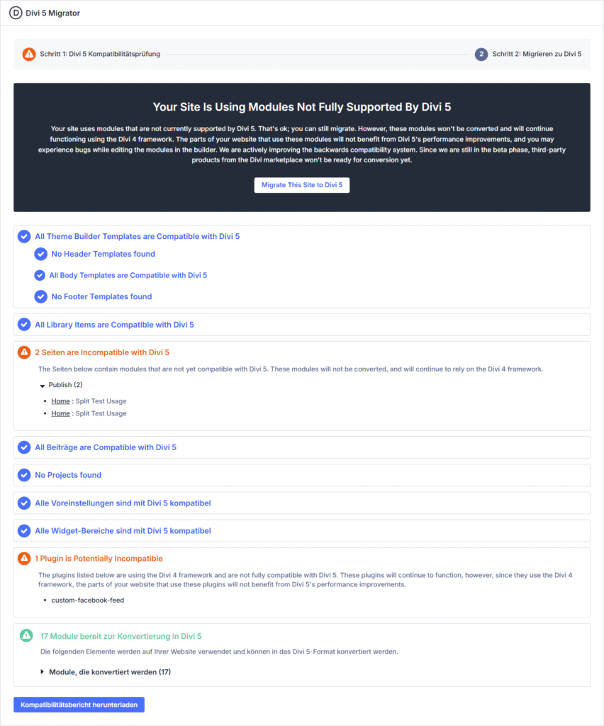 Im Normalfall wird man allerdings nicht Seite für Seite konvertieren, sondern die gesamte Website. Hierfür gibt es den Divi 5 Migrator, der zuerst die gesamte Website auf mögliche Kompatibilätsprobleme prüft und einen entsprechenden Bericht ausgibt. In unserem Fall listete der Bericht einige wenige Probleme auf, die uns aber nicht daran hinderten, die Migration durchzuführen.