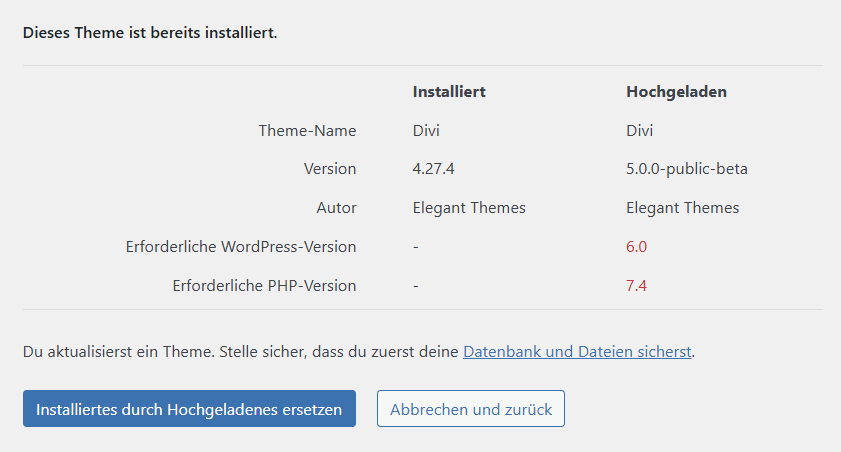 Unseren Test haben wir selbstverständlich nicht auf dem Live-System, sondern auf einer Kopie gemacht. Wie im Video beschrieben haben wir dazu die aktuelle Divi 5 Public Beta aus unserem Konto bei Elegant Themes herunter- und in unsere Test-Installation hochgeladen. Divi 5 erkennt Divi 4 als seinen Vorgänger und fragt wie gewohnt, ob die alte Version ersetzt werden soll: